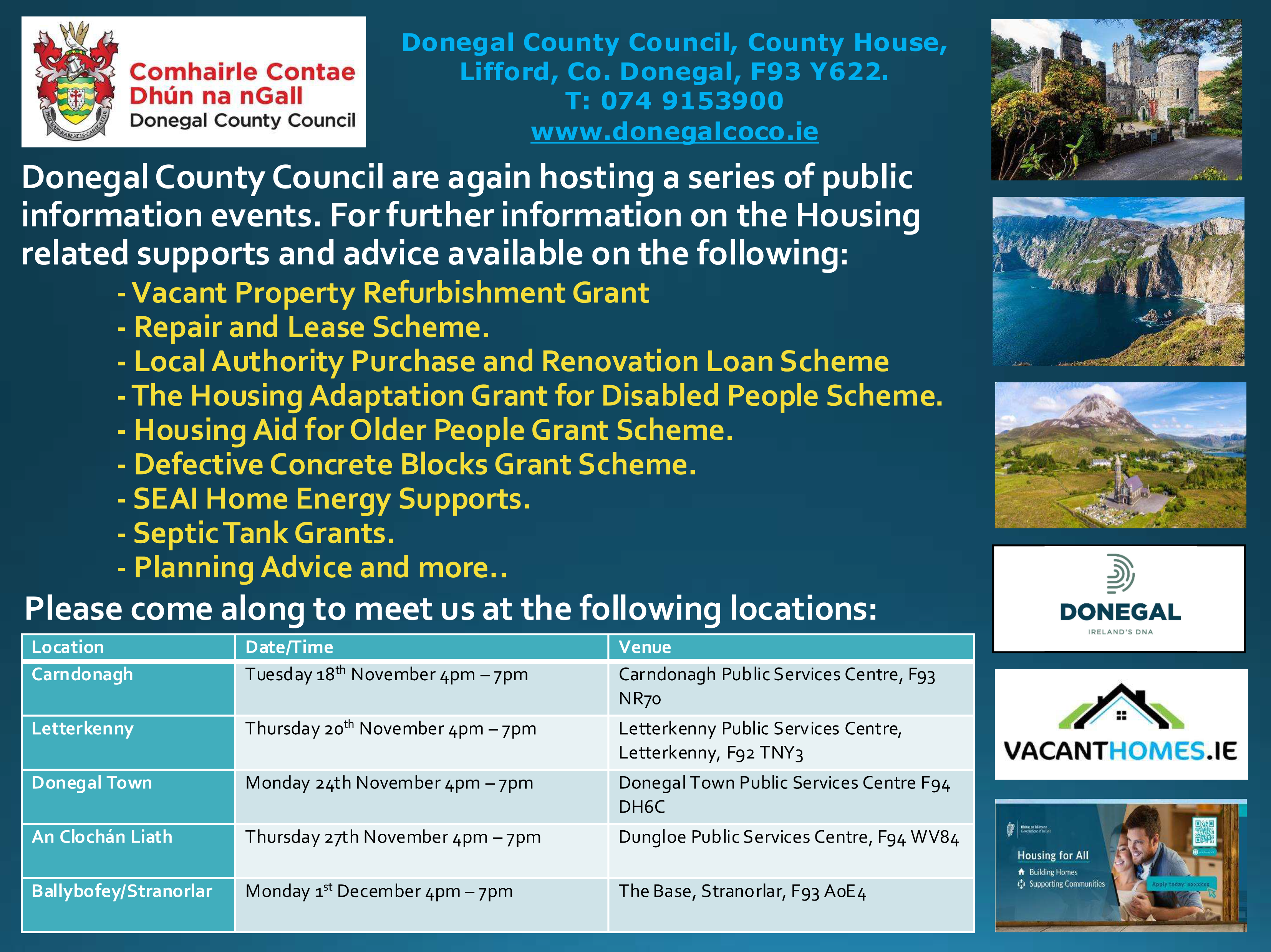 There are various initiatives and funding available across numerous agencies to assist people with housing related issues such as bringing vacant homes back to use, adapting homes for people with mobility needs, improving homes for older people and improving the energy efficiency of homes. Donegal County Council is facilitating Information Sessions in each Municipal District over the next number of weeks, following a recent motion passed at Plenary Council.
