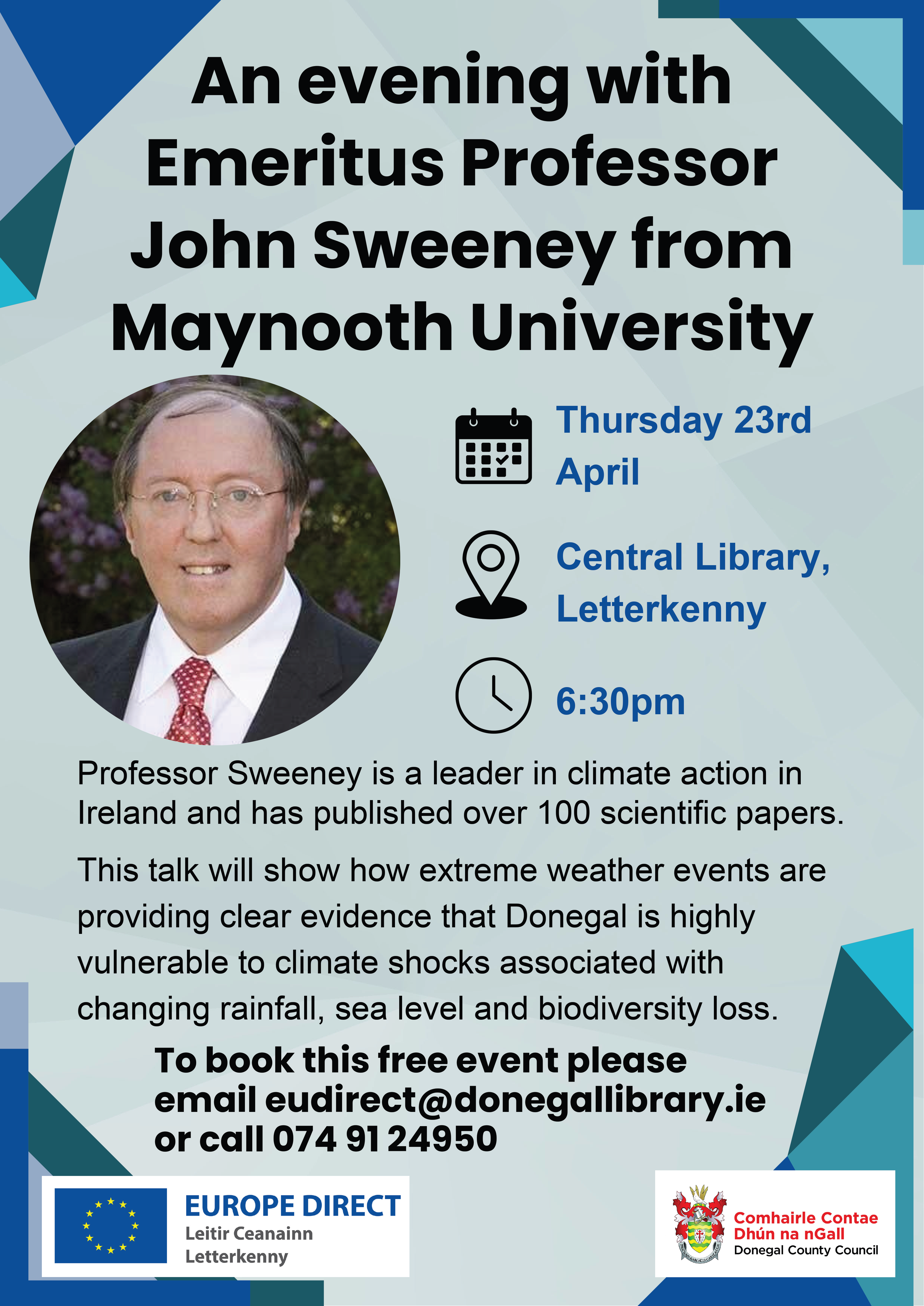 Dúirt an tOllamh Sweeney, “Tá áthas orm a bheith i gcomhpháirtíocht le Europe Direct Leitir Ceanainn don ócáid seo. Tá déine agus líon na dtarluithe adhaimsire ag méadú agus is léiriú é sin go bhfuil cruachás na haeráide agus na bithéagsúlachta ag méadú, in ainneoin go bhfuil neamhaird á déanamh air seo ag leibhéal náisiúnta agus idirnáisiúnta. B’fhurasta na héifeachtaí a bhaineann le hathrú fearthainne, le leibhéal na farraige agus le ganntanas sa bhithéagsúlacht, a fheiceáil in Éirinn, agus i nDún na nGall ach go háirithe. De bharr dul chun cinn san eolaíocht aeráide le déanaí, is léiriú é seo fosta ar an phráinn atá le hastaíochtaí gás ceaptha teasa a laghdú de réir mar a thagann pointí claochlaithe chun cinn, nó nuair a sháraítear iad fiú. Tá easpa muiníne ag baint le cur i bhfeidhm beartas náisiúnta. Ina áit sin, tá roghanna polaitiúla gearrthéarmacha á ndéanamh mar fhreagairt ar bhrúghrúpaí cumhachtacha atá ag eascairt as buiséid charbóin atá ina cheangal ó thaobh dlí de. Is bagairt mhór í an easpa gnímh do shochaí na hÉireann sna deich mbliana atá amach romhainn.”